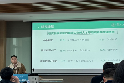沈文娇副教授及研究生贺怡菲以“高中生研究性学习能力何以形成——拔尖创新人才的早期培养”为主题作报告。她们的研究指出,研究性学习能力是拔尖创新人才早期培养的关键特质。