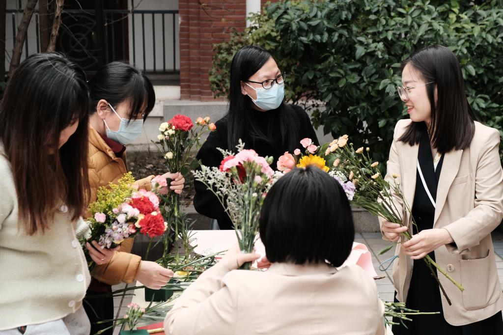 实践环节中,师生们运用插花技巧,巧妙地构思、修剪和装饰,将康乃馨、玫瑰、向日葵、雏菊、满天星等鲜花,装点成春意盎然、独具匠心的插花作品。师生们专注地摆弄着手中的鲜花,在工作与学习之余享受花样年华,放松身心,感受美好。
