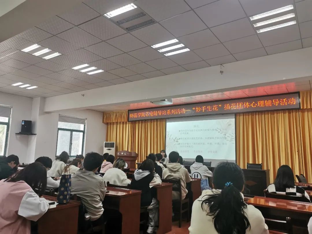 心理团体辅导于williamhill英国官网223报告厅开展。杨老师首先讲解心理学相关知识与“芯宠”辅导站设立缘由,传授插花相关技巧,借“芯宠”花语传达师范生培养特色,引导员工感知自然生机,汲取向上力量,激励自我成长。