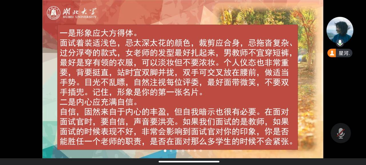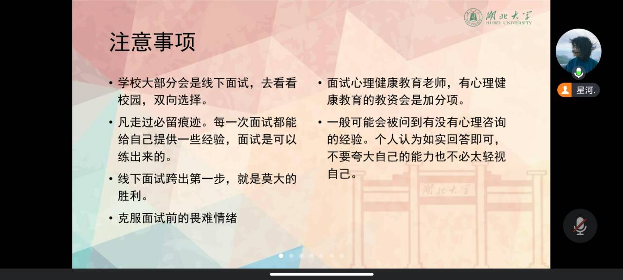 活动伊始,张方结合自身在武汉市光谷第二十七小学的求职经历,为师范生们详细讲解了求职中岗位报名、笔试、面试、体检和签约等各个环节需要注意的事项。梅紫依则结合自身现就职于武汉市光谷汤逊湖公司的个人经验,就师范求职过程中如何高质量填写、投递简历与师范学子进行了细致的分享。刘延婷从心理学专业就业角度出发,结合自身求职于仙桃市第一中学的经历,分享自己作为一名心理健康老师的求职之路。