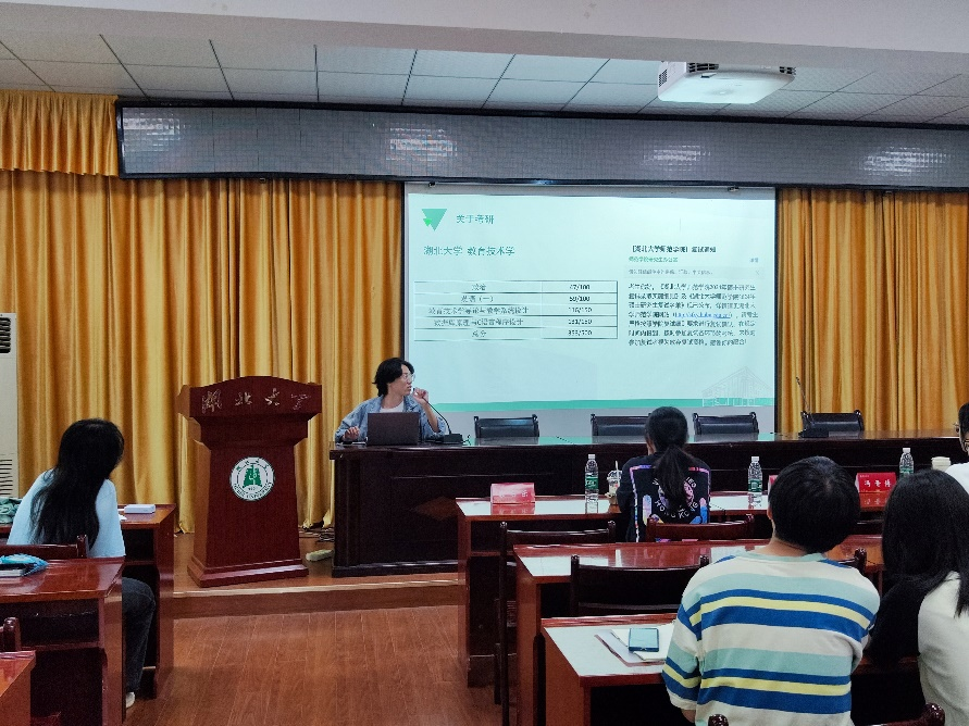 2020级教育技术学冯晋博以为什么考研为出发点,强调不能盲目跟风考研。随后向大家讲解了择校等问题,告诫大家切忌扎堆报考,慎重考虑跨专业考研。最后,她提到“考研本身就是一场与自己为敌的战斗,要有一战成硕的信心,也要有面对失利的勇气”。