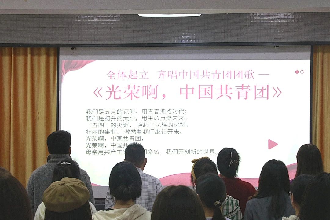 在会议正式开始之前,参会人员全体起立,齐唱中国共青团团歌《光荣啊,中国共青团》。
