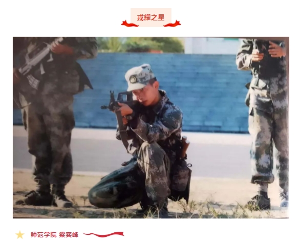 2023级汉语言文学专业退役军人梁奕峰,因表现优秀被单位选改为军士,成为连队最年轻班长,带领反坦克导弹班在战区抽考中创全员合格、个人全优战绩,担任基层政治教员,获优秀“四会”教练员称号。退役后主动报名转入汉语言文学师范专业就读,在寒假报名参加公司寒假社会实践活动并获评社会实践优秀个人;利用寒假开展具有军人特色的支教活动,支教时长超120小时,被退役军人事务局、翔云中心小学点名表扬。积极开展征兵宣传工作,投身志愿服务和员工工作,获各级荣誉数十项。入选预备役部队,以冲锋姿态践行“若有战召必回”誓言,以军人本色在校园与社会彰显担当。