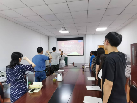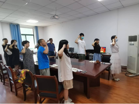 党日活动在庄严的国歌中拉开帷幕,随后,党支部党员邓明静领誓,新老师生党员一同宣读入党誓词,表达不忘初心、继续前行的坚定信念。