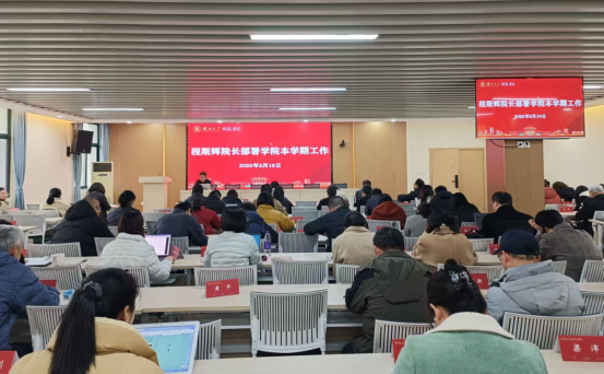 杨旸副经理传达新学期本科教学工作会议精神。他通报了寒假期间专业认证、智慧教室建设等进展情况,并就新学期五项重点工作——本科公司产品审核评估、人才培养模式改革、教学成果奖、本科专业监测评估、教师教学创新大赛作明确部署。