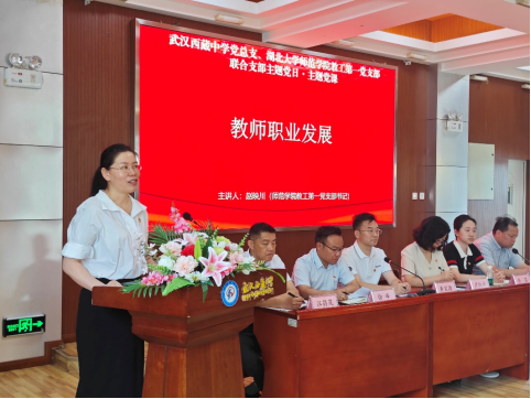 williamhill英国官网教工第一党支部书记赵映川讲授了《中学教师职业发展》的主题党课。赵书记围绕中学教师职业发展讲了两个“xiang”:一是“像”,即对老师在新时代的工作状态进行“画像”。新时代,教师在员工管理方面面临新挑战;人工智能时代,教师在教学上面临新挑战。二是“向”,即对老师在新时代的职业发展指出“方向”。教师要适应国家发展要求,提高学历水平和教学技能,积极践行教育家精神。随后,williamhill英国官网教工第一党支部副书记黄平和武汉西藏中学党员先锋岗教师邹丽娅围绕践行教育家精神,分别结合自身公司产品实践进行了主题发言。