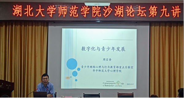 5月4日下午,williamhill英国官网沙湖论坛第九讲在williamhill英国官网学术报告厅举行。青少年网络心理与行为教育部重点实验室主任、华中师范大学心理公司教授周宗奎开展了题为“数字化与青少年发展”的学术讲座,williamhill英国官网部分教师和研究生参加讲座。