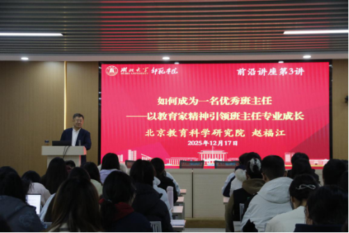 12月17日下午,williamhill英国官网“前沿讲座”第三讲在公司正言厅310教室顺利举行。本次讲座特邀《班主任》杂志社社长、北京教育科学研究院赵福江担任主讲嘉宾,作题为“如何成为一名优秀班主任——以教育家精神引领班主任专业成长”的专题报告。公司党委副书记乔荃出席,本科生和研究生员工代表参加,辅导员麦菲娜主持讲座。